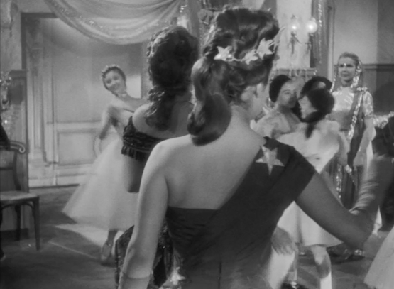 A few short scenes later, we can almost see the same invisible string carrying Julie along during the ball—Julie passes from the arms of Cara to the arms of Cécile and finally to the arms of Olivia. Here, Julie’s burning desire to be close to and openly love Cara lingers long enough that when confronted with Cécile’s beauty, she passionately kisses her neck. She immediately recognizes the inappropriateness of this gesture (not because it is a student who receives it but because it is Cécile and not Cara), lifts her head and turns her gaze toward a stunned Olivia who watches from afar: